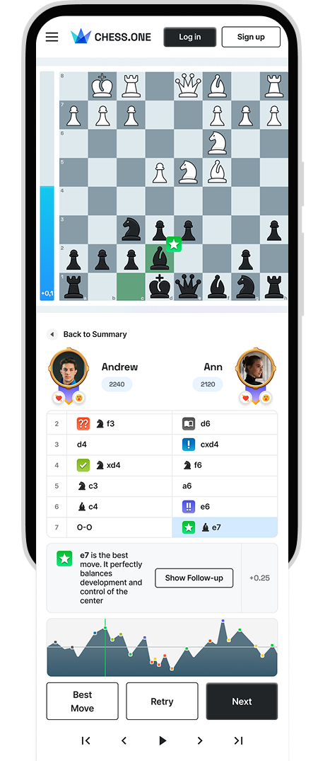 Review every move with our engine to identify Brilliant, Great, and Missed Win opportunities